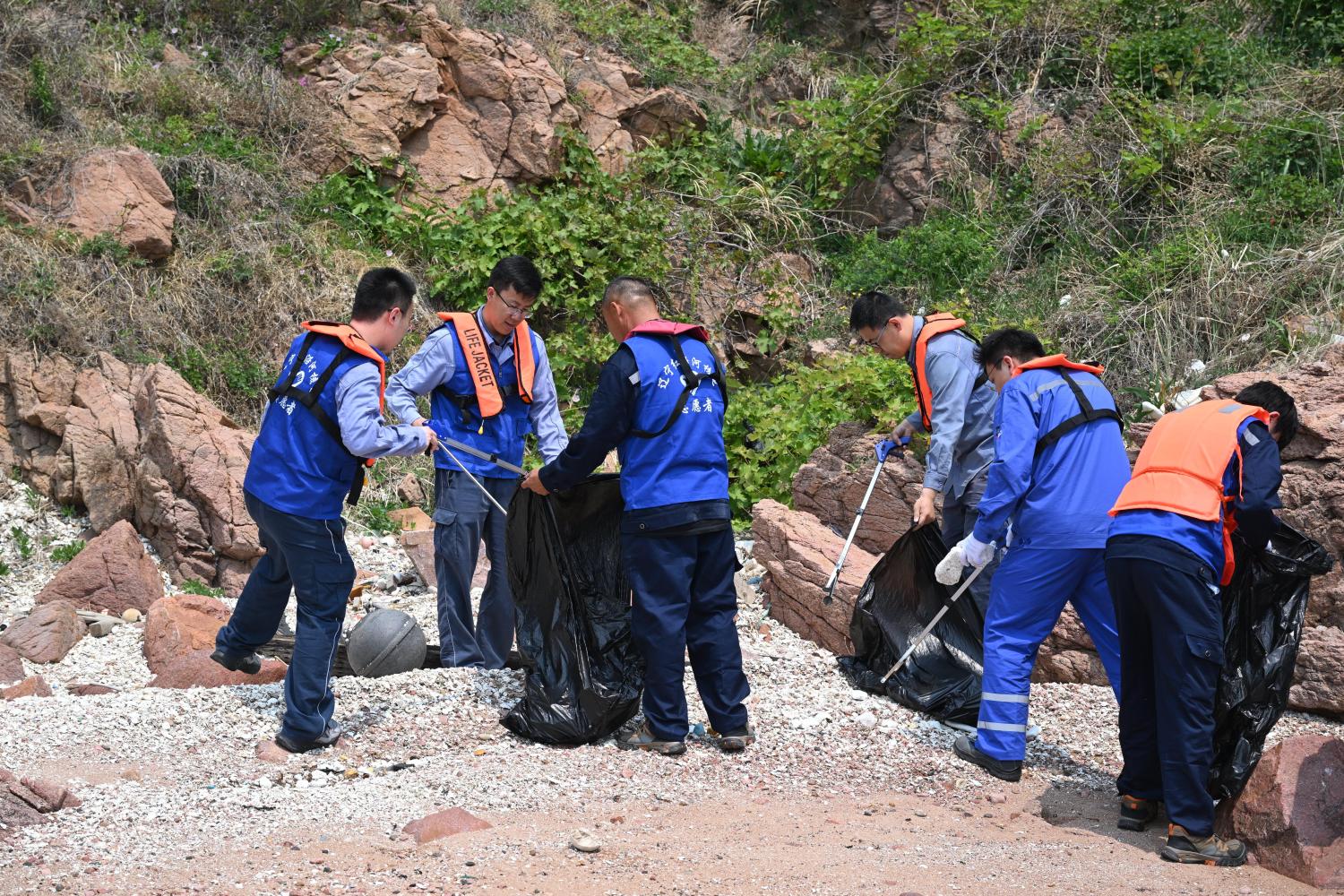 本次活動重點針對取水口周邊、花蹊及常規島北側區域展開清潔,發揮青春力量,助力美麗場區建設和冷源防抗任務。在取水口區域,志愿者使用工具清理海浪沖刷上來的漂浮物;花蹊區域重點清除塑料袋、飲料瓶等生活垃圾;常規島北側則對衛生死角全面排查,拔除石縫中生長出的雜草。在1個多小時的活動中,志愿者們累計拾取了7大袋垃圾。